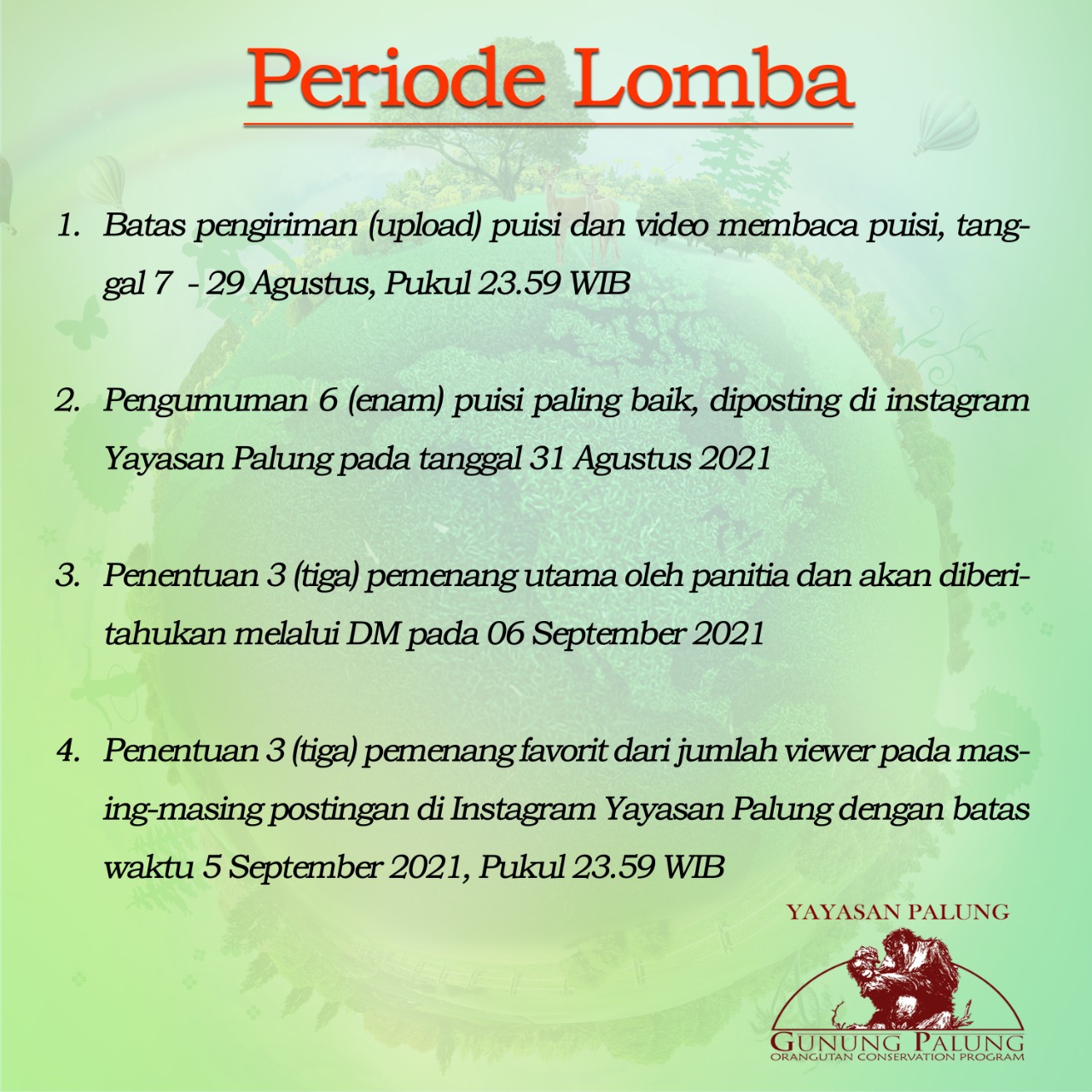 Penentuan 3 (tiga) Pemenang favorit dari jumlah viewer pada masing-masing postingan di Instagram Yayasan Palung dengan batas waktu 5 September 2021, Pukul 23.59 WIB.