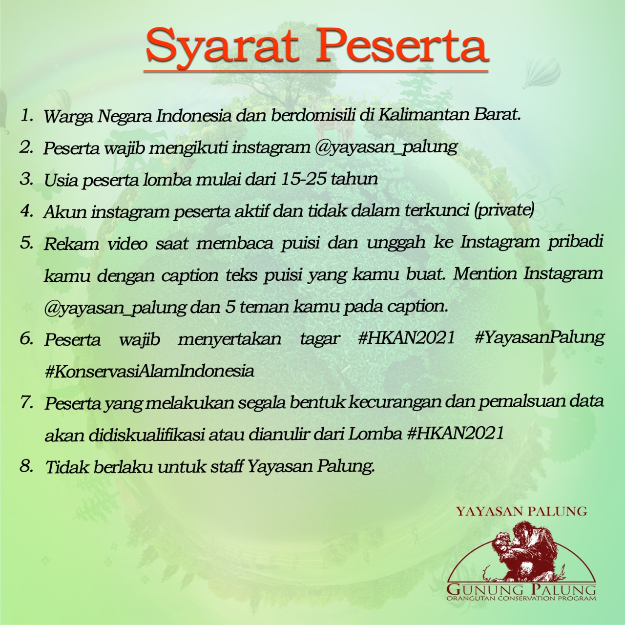 Rekam video saat membaca puisi dan unggah ke Instagram pribadi kamu dengan caption teks puisi yang kamu buat. Mention Instagram @yayasan_palung pada foto dan 5 teman kamu pada caption