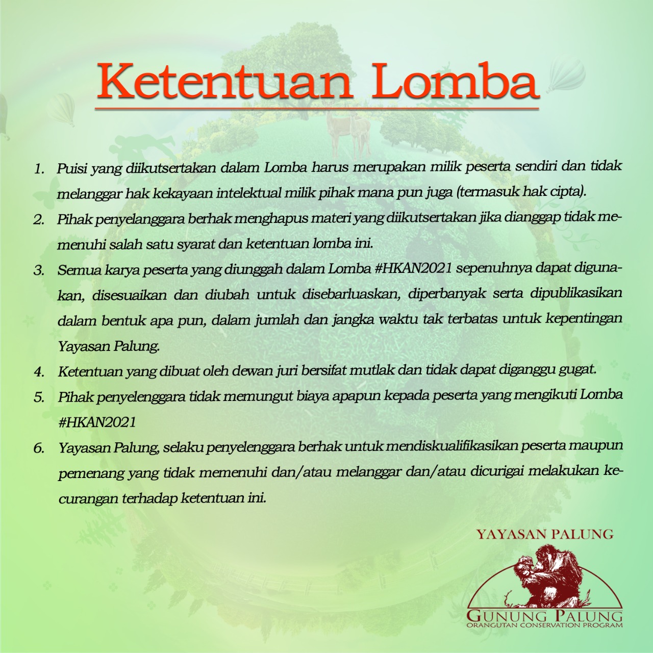 Semua karya peserta yang diunggah dalam Lomba #HKAN2021 sepenuhnya dapat digunakan, disesuaikan, dan diubah untuk disebarluaskan, diperbanyak serta dipublikasikan dalam bentuk apa pun, dalam jumlah dan jangka waktu tak terbatas untuk kepentingan Yayasan Palung.
